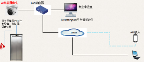 安装电梯阻车摄像机后,如发现了门口和轿厢内的电动自行车,摄像机会发送控制信 号,不让电梯关门,电梯停止运行,通过喇叭自动发送劝离语音,从而阻止电动车乘坐电梯。同时,物业中心接收到现场图像告警,掌握现场情况,并可远程喊话,进行驱离。待电动自 行车离开,摄像机自动恢复电梯的载客运行。